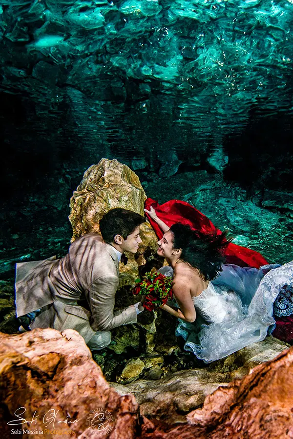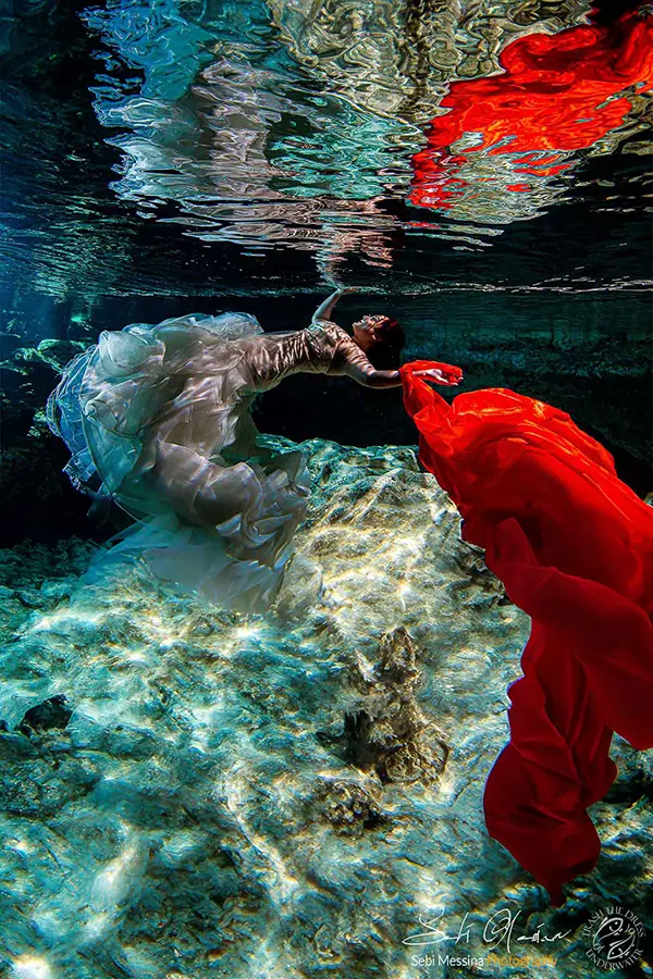 Flowing fabrics photograph beautifully here. We’ll guide you based on the look you want. We also provide complimentary wardrobe options, underwater modeling dresses and, for Trash the Dress, wedding gowns, plus a selection of props.