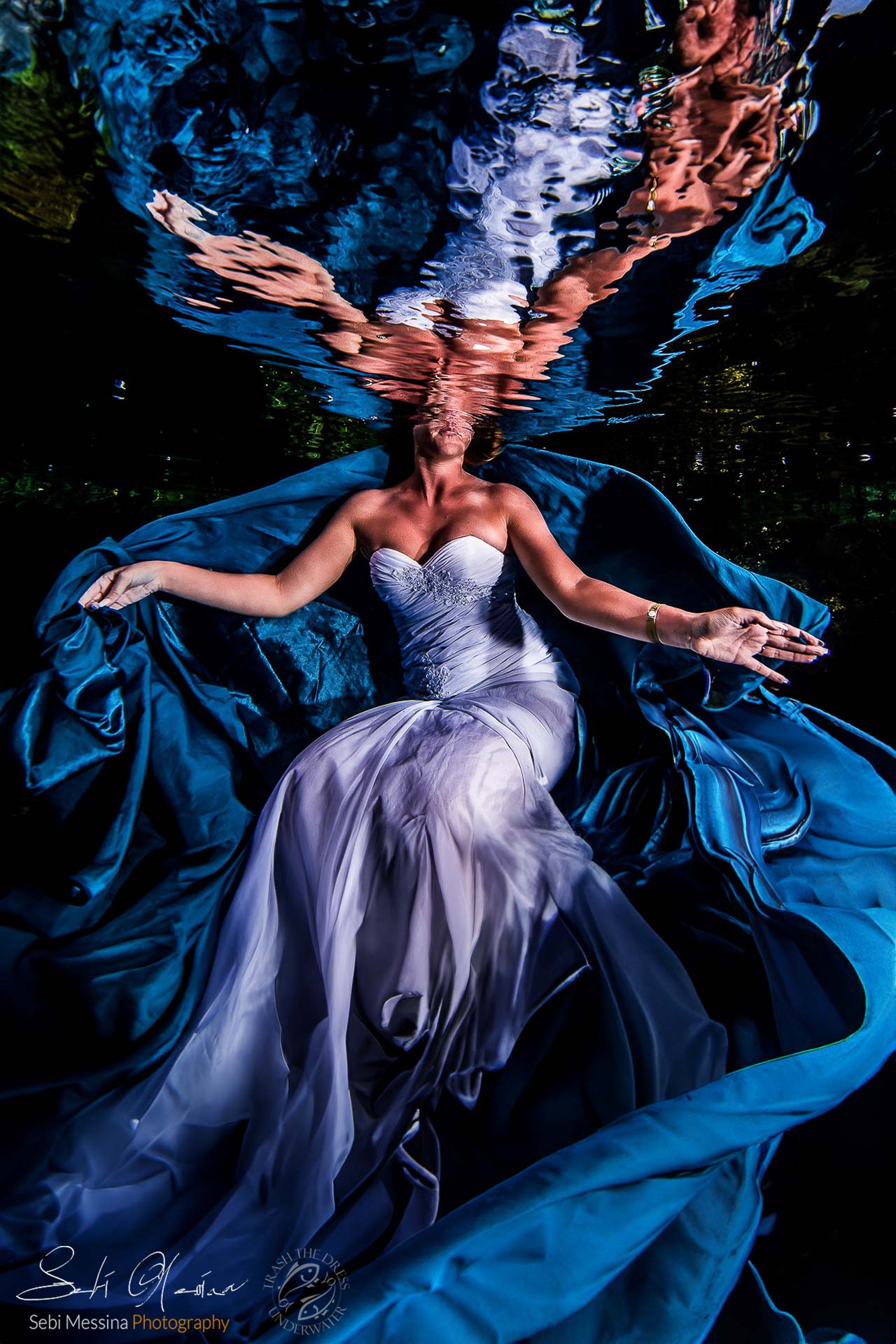 Underwater Trash the Dress bride in a cenote near Playa del Carmen, Riviera Maya, floating beneath the surface with a mirror-like reflection.