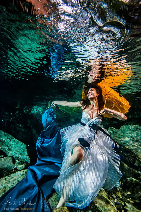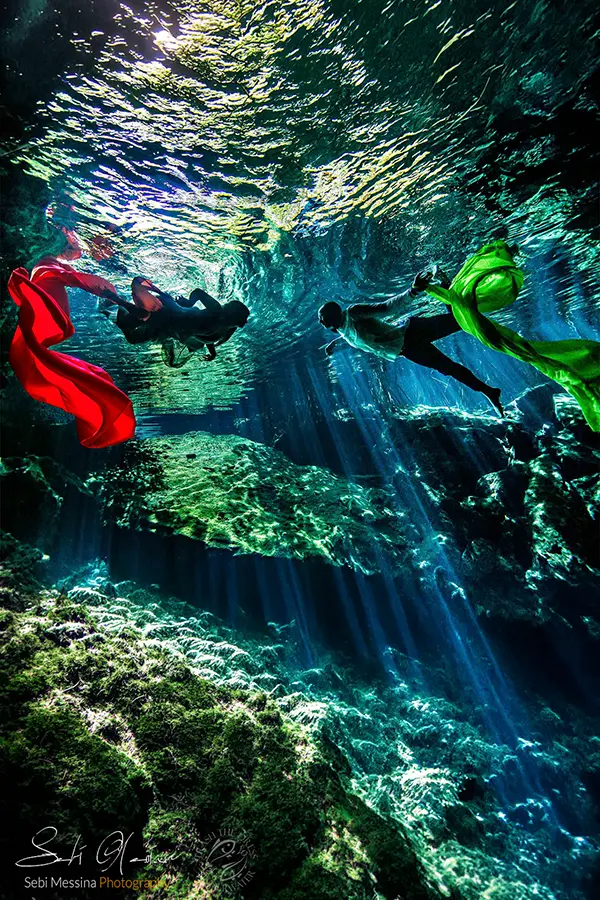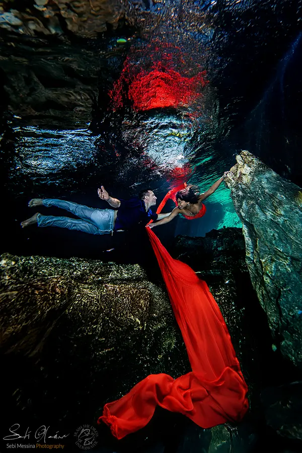 • Mixed on-land + underwater couple photos in a cenote between Playa del Carmen and Tulum