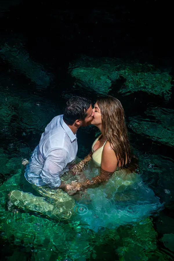 A cenote proposal + underwater engagement session is different. It’s intimate, cinematic, and wildly original: the surprise happens on land at the cenote’s edge, and the celebration continues where few couples ever go, in crystal-clear freshwater, suspended in silence, turning emotion into art.