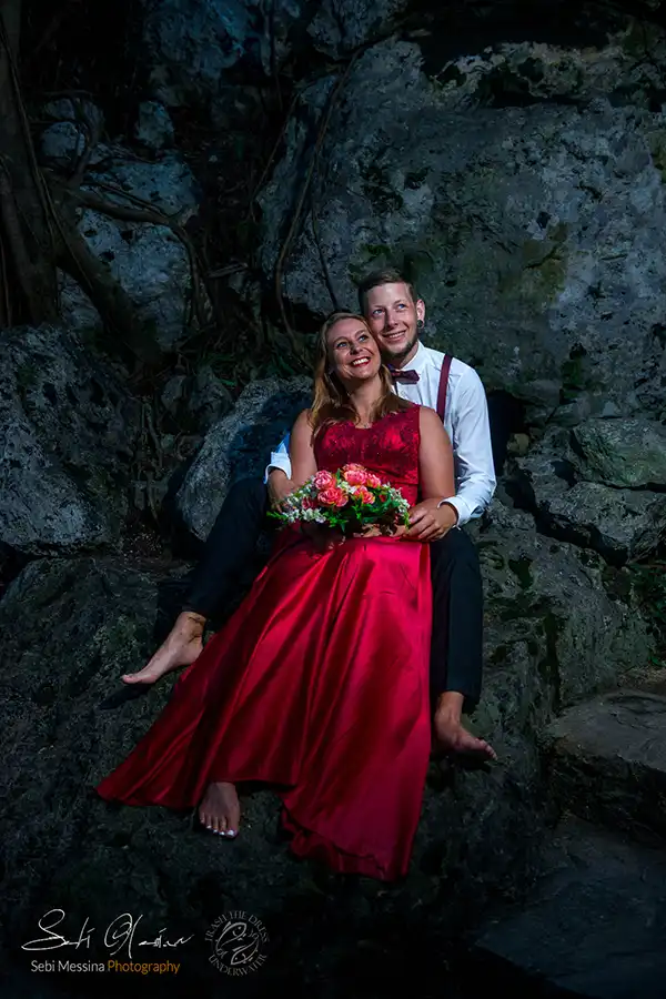 On-land engagement portrait in a Riviera Maya cenote between Playa del Carmen and Tulum, Mexico: smiling couple seated on limestone rocks, woman in a flowing red dress holding a bouquet, man in a white shirt with suspenders behind her.