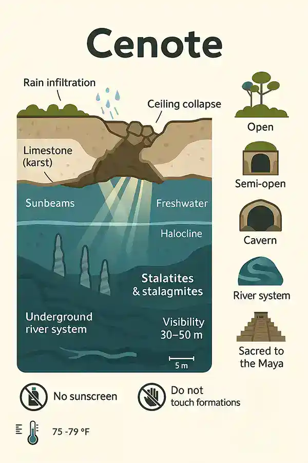 Cenotes are water-filled karst sinkholes—formed when limestone collapses and exposes underground rivers and caves. Widespread in the Riviera Maya/Yucatán, they can be open, semi-open, or cavern type.
